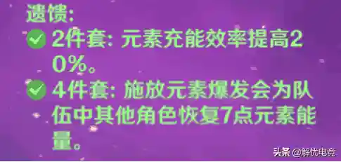 而遗馈套的4件套效果“释放元素爆发会为队伍中其他角色回复7点元素能量”,这不但能让阵容全体角色的充能速度更快,更是可以让其他角色帮助芭芭拉充能,让芭芭拉的大招好的更快。